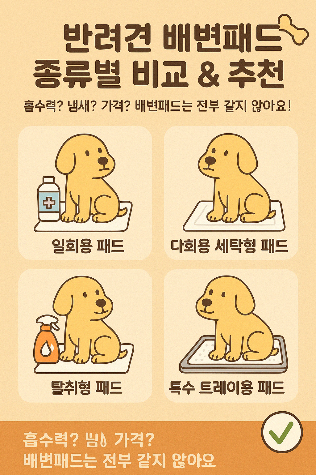 🧻 반려견 배변패드 종류별 비교 & 추천 🧻 "흡수력? 냄새? 가격? 배변패드는 전부 같지 않아요!"강아지의 실내 배변 습관을 좌우하는 배변패드,처음엔 ‘그냥 깔기만 하면 되는 거 아냐?’ 싶지만막상 사용해보면 흡수력, 방수, 냄새, 가격이 다 다르죠 🤔오늘은 패드 종류별 특징부터 추천 브랜드, 상황별 선택 팁까지진짜 필요한 정보만 정리해드릴게요 🐾✅ 배변패드, 종류부터 다릅니다분류특징추천 대상🧴 일회용 패드가장 일반적, 저렴하고 간편일상 사용, 교체 자주 가능할 때♻️ 다회용 세탁형 패드친환경, 반복 사용 가능경제적/환경 고려, 훈련 완료견👃 탈취형 패드냄새 중화 성분 포함장시간 외출 시, 실내 냄새 신경 쓸 때💦 고흡수 프리미엄형흡수력+건조력 뛰어남대형견, 다견가정, 1일 1교체 희망 시..